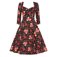 Black Multi Red Floral Print 3/4 Sleeve Sweetheart Neckline 50s Swing Dress With Pockets