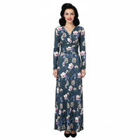 This elegant long sleeve maxi dress features a wrap-effect design with a flattering waistband and an easy overhead fit. Crafted from a soft, stretchy fabric, it offers a luxurious and comfortable feel. The dress showcases a finely detailed floral print set against a rich navy background, making it a timeless choice for sophisticated events and stylish parties.