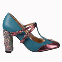 Teal And Metallic Bordeaux Vintage Twin Strap High Heel Shoes