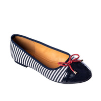 These Navy Blue and White Striped Ballerina Pumps Flats combine classic elegance with playful charm. The timeless stripe pattern pairs beautifully with a delicate red lace tie bow, adding a refined pop of colour. Designed for comfort and style, these flats offer a perfect balance for both casual and dressier occasions. Their versatile design ensures they complement a wide range of outfits, making them an essential addition to any sophisticated wardrobe. Whether at work or a weekend outing, these ballerina pumps provide effortless grace from morning to evening.