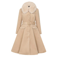 • Introducing our stunning new Swing Coat, a timeless piece crafted from sumptuous winter-weight fabric that delivers both softness and warmth. The standout detachable faux fur collar adds an element of refined elegance, whilst the generous swing silhouette accommodates voluminous petticoats for authentic vintage styling. In a versatile natural beige tone, this coat transitions effortlessly from evening occasions to urban exploration, pairing beautifully with our swing and wiggle collections. The cinched waist belt enhances your silhouette whilst maintaining the ease and comfort you deserve throughout the colder months. A sophisticated wardrobe essential for those who appreciate classic design with contemporary comfort.