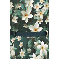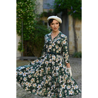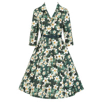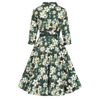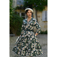 Embrace timeless sophistication with this stunning Floral Tea Dress, seamlessly blending vintage inspiration with contemporary elegance. This dress showcases a refined lapel collar and elegant ¾ length sleeves for a polished look. A delicate row of front buttons enhances its classic design. Set against a rich dark green background, it features an array of vibrant cream and yellow flowers, complemented by soft green foliage and painterly floral accents. The waist is defined by a belt with belt loops, and discreet side-seam pockets offer practicality without sacrificing style. Ideal for autumn strolls, weekend brunches, or special events, this dress adds floral grace to any ensemble.
