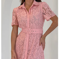 Pink Lace Short Sleeve Button Shirt Midi Tea Dress