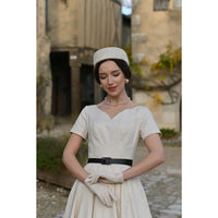 This ivory swing dress channels vintage allure with understated sophistication. The soft V-neckline and short sleeves create a romantic frame, whilst the cinched waist belt sculpts an elegant hourglass silhouette. A generously cut 1950s-inspired skirt provides graceful movement and volume, making it equally suited to refined daytime wear or special occasions. Crafted in a pristine ivory shade that complements any complexion, this timeless piece delivers effortless femininity and enduring style—a refined addition to any discerning wardrobe.