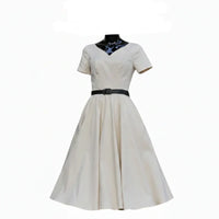 Vintage Ivory V Neck Belted Short Sleeve Swing Dress