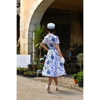 White And Blue Rose Cap Sleeve Cotton Garden Tea Dress