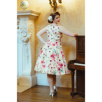 Soft Yellow Cream and Pink Rose Print Summer Party Swing Dress