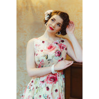 This enchanting swing dress captures the essence of vintage summer style with its warm cream/soft yellow canvas adorned with delicate rose, blush, and berry florals. The thoughtfully designed bodice showcases a refined round neckline with subtle front detailing and structured straps that evoke timeless elegance. A precisely tailored waist transitions seamlessly into a generously proportioned 1950s-inspired skirt, delivering the graceful movement and flattering silhouette that we at Pretty Kitty are renowned for. Constructed from supple, breathable premium cotton fabric, this dress seamlessly transitions from garden parties to outdoor gatherings, offering an effortlessly polished aesthetic for those seeking understated romance and refined femininity.