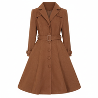Elevate your autumn and winter wardrobe with this exquisite Swing Coat in a deep, elegant brown. Featuring a tailored lapel collar, this coat offers a refined silhouette enhanced by buttoned panels along the front and back bodice. The single-breasted front buttons gently open to a flared skirt, cinched elegantly at the waist with a belt, while discreet side seam pockets add practicality. Inspired by 1950s vintage designs with a contemporary edge, this coat combines timeless style with comfort, making it an essential addition for those who appreciate classic sophistication.