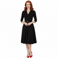 This season's must-have office dress features a gorgeous and sumptuous black criss cross textured fabric. It boasts a classic lapel collar and a coordinating black belt, complemented by decorative buttons down the front. The design includes a flattering full swing skirt and three-quarter length sleeves for a polished, sophisticated look. Luxurious and sumptuous stretch fabric.