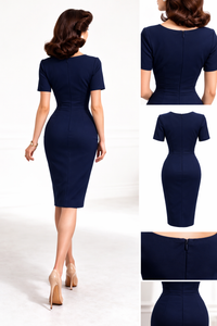 Embrace timeless elegance with this navy blue wiggle dress, expertly crafted in the UK, exclusively for Pretty Kitty. Featuring a refined round neckline and half-length sleeves, this bodycon silhouette flatters with precision darting and a structured waistband. Whether for the office, or an occasion, the premium stretch fabric ensures comfort and movement, while the concealed back zip provides a seamless finish. Equally at home in the boardroom or at an evening event, this versatile piece transitions effortlessly from professional to polished.