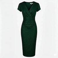 Forest Green Glitter Sparkle Deep V Cap Sleeve Bodycon Ruched Waist Wiggle Dress