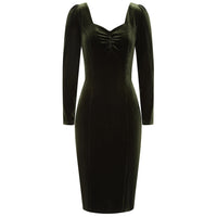 Embrace vintage glamour in this figure-flattering retro-inspired green Velvet Wiggle Dress. Designed with a romantic sweetheart neckline and long sleeves featuring softly gathered shoulder seams, this dress offers a touch of 1950s elegance. Subtle gathering along the front bust enhances the silhouette, while a hidden back zip ensures a sleek, seamless fit. In a dark Fern green shade. Perfect for adding classic sophistication to your day or evening wardrobe.