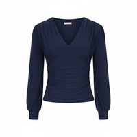Navy Blue Long Sleeve Gathered V Neck Top
