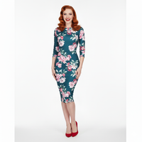 Teal Green and Pink Floral 3/4 Sleeve Bodycon Pencil Wiggle Dress